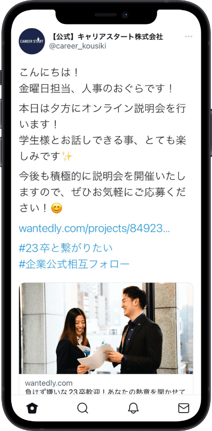 キャリアスタートの採用情報や、日常を日替わりで社員がツイートしています。